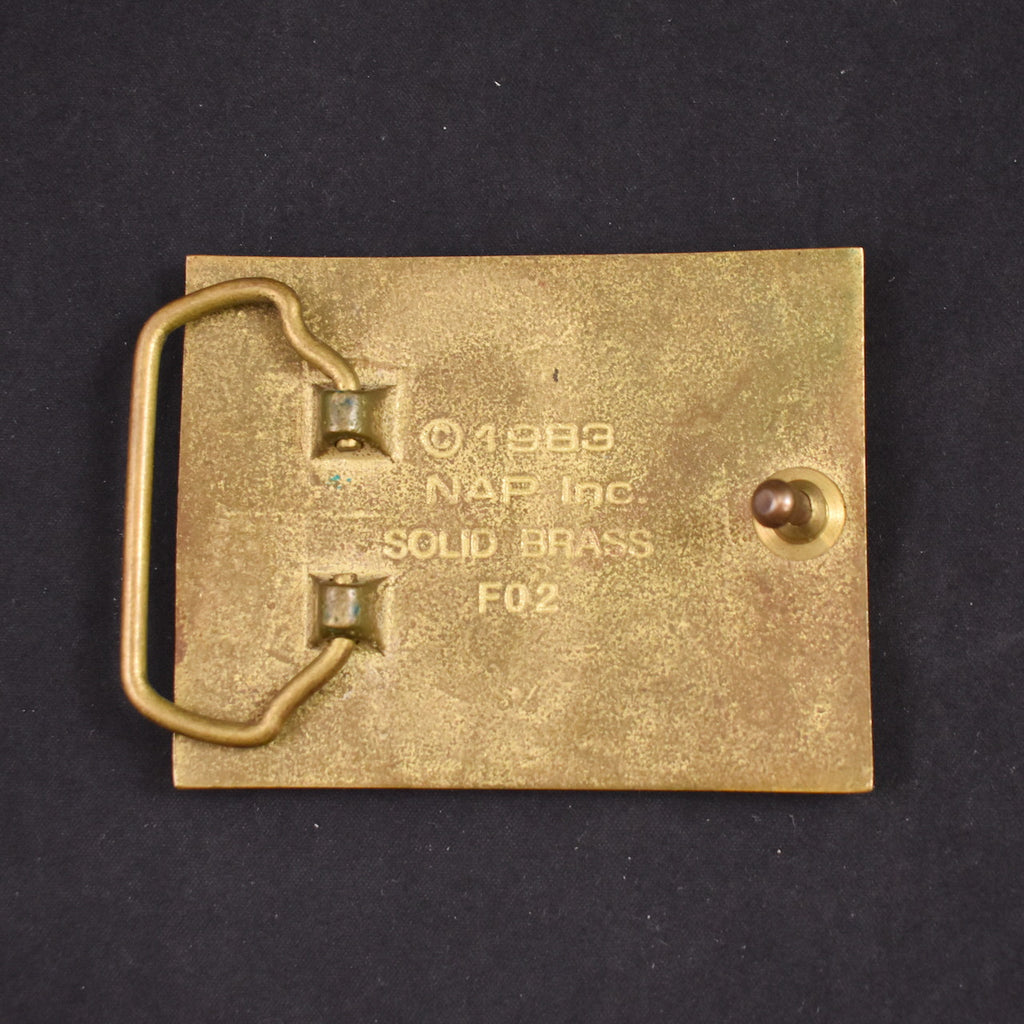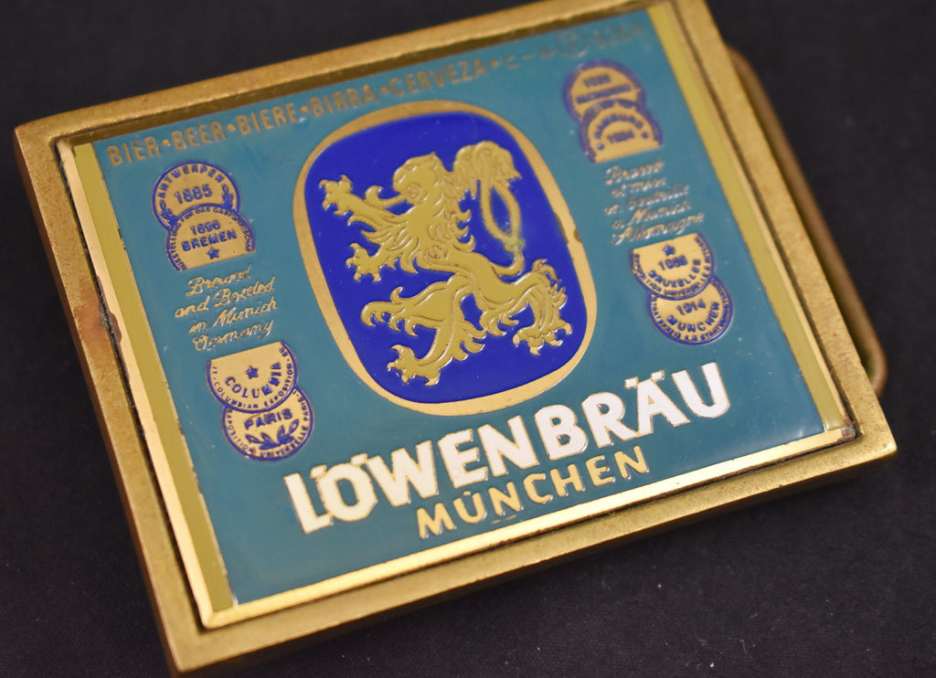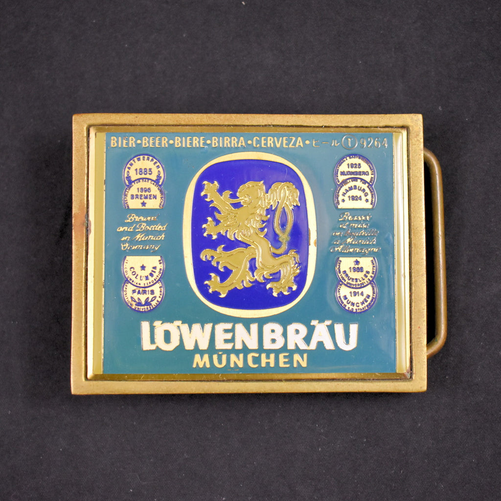 Belt buckles are a great way to show off your style and interests and they took off with commercial success in the 1970s. This belt buckle rectangular and brass with an enamel Lowenbrau logo on the front, good condition, wear to the edges of the enamel, measures 3 inches wide and 2 1/4 inches tall, stamped on the back "1983 NAP Inc., solid brass FO2". This is an authentic vintage buckle in wearable condition, that has been cleaned and repaired (if necessary). Flaws will be noted, but please ask any questions you may have as this is a FINAL SALE item and cannot be returned.