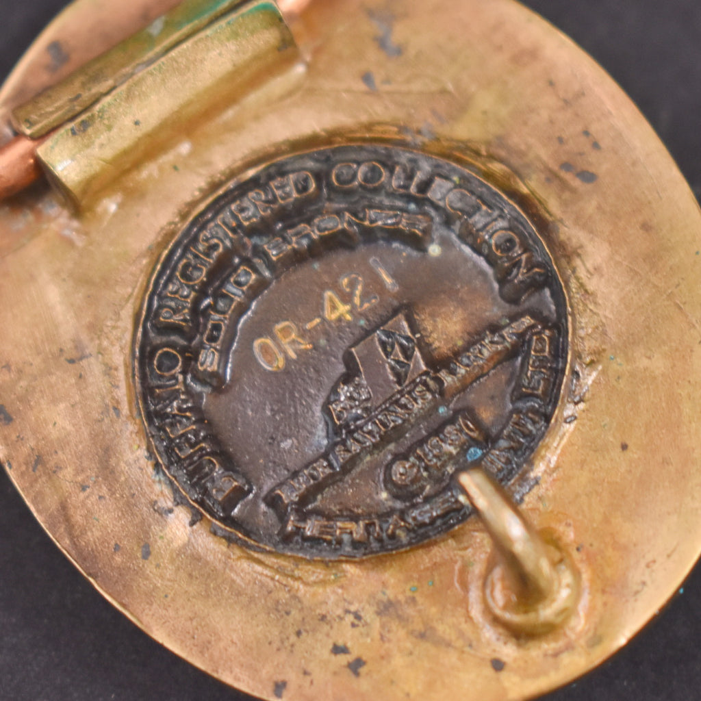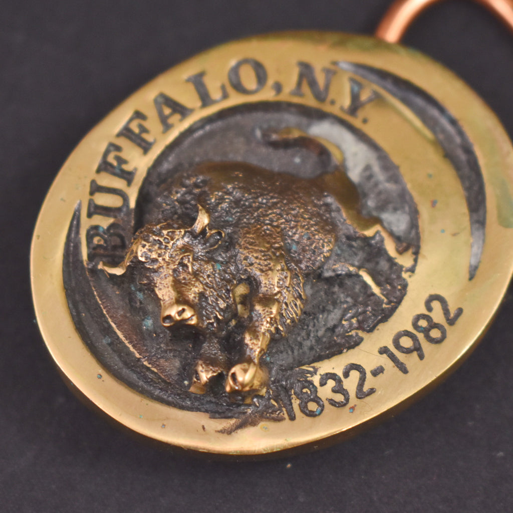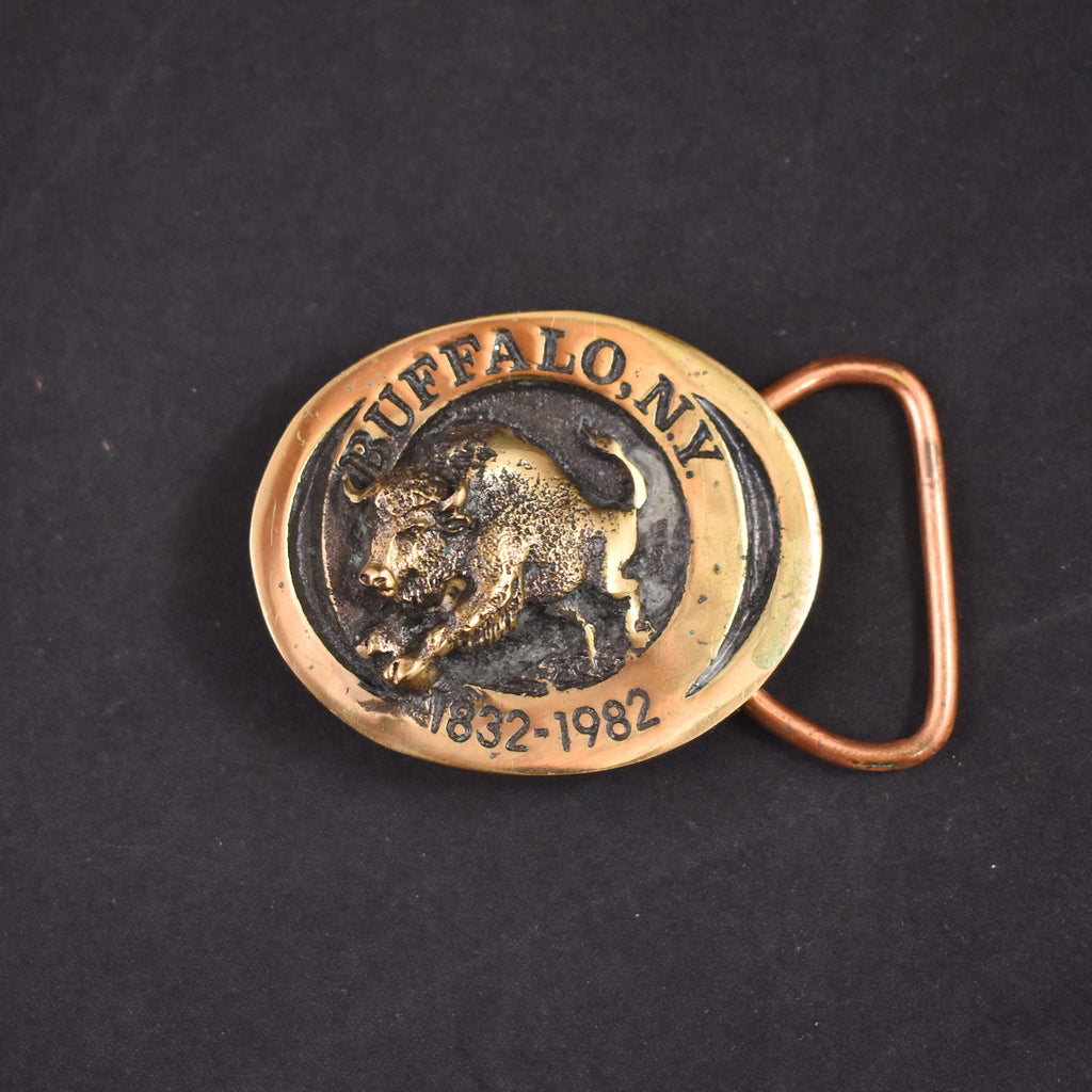 Belt buckles are a great way to show off your style and interests and they took off with commercial success in the 1970s. This belt buckle is brass and features a small charging Buffalo and reads "Buffalo, NY 1832-1982", measures 2 inches wide and 1 3/4 inches tall, there is a seal on the back that reads "Buffalo Registered Collection, solid bronze, Heritage Mint Ltd 1981", and it's numbered with the original paper certificate and suede storage bag. Minor scuffs and discoloration from age. This is an authentic vintage buckle in wearable condition, that has been cleaned and repaired (if necessary). Flaws will be noted, but please ask any questions you may have as this is a FINAL SALE item and cannot be returned. OR-421