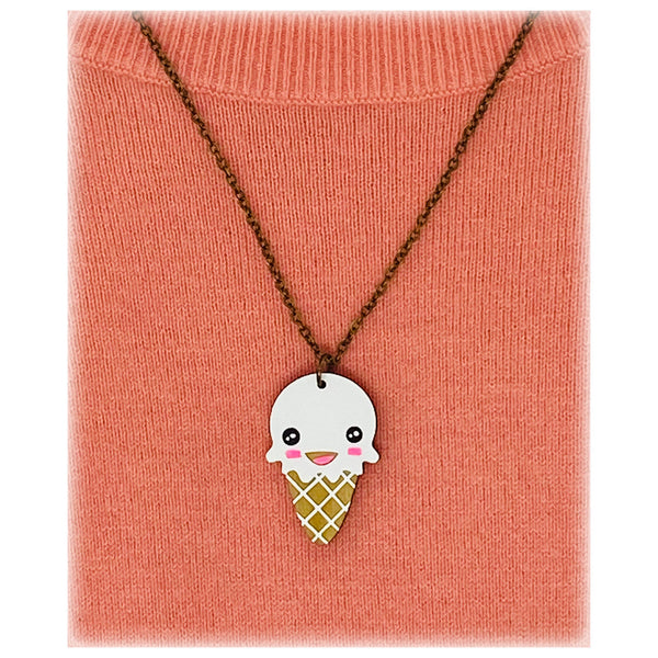 Retro A Go-Go Writes, "Blushing and smiling this happy ice cream is quite the treat, so cute, so joyful and deliciously sweet. This little buddy will brighten your day, always be cheerful and ready to play. Ice Cream Pendant crafted of laser-cut wood measuring 1" width by 1-½" height by 1/8" depth. Small-looped brass chain measuring 18-½" with a sturdy, easy open/close clasp. Carefully crafted by hand and Made in the U.S.A." Chain measures about 18 inches.