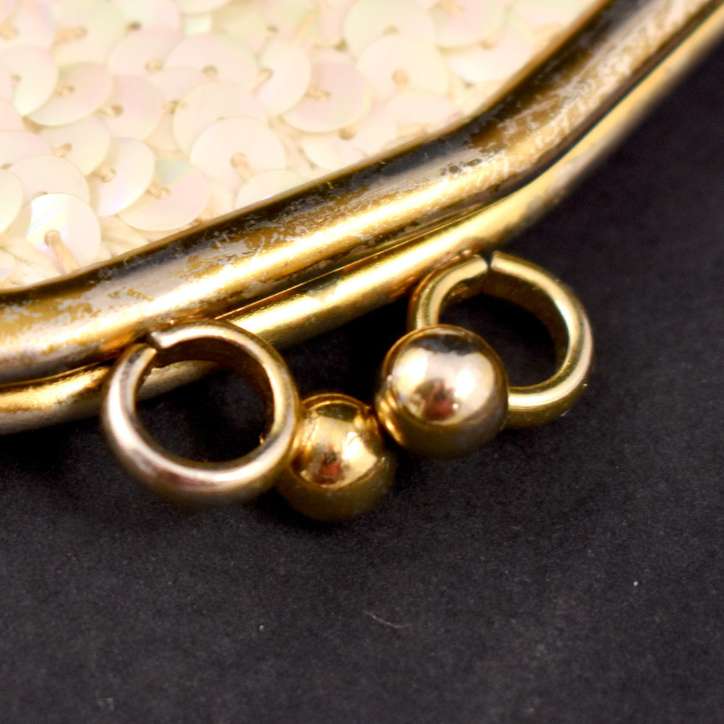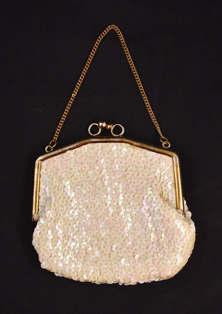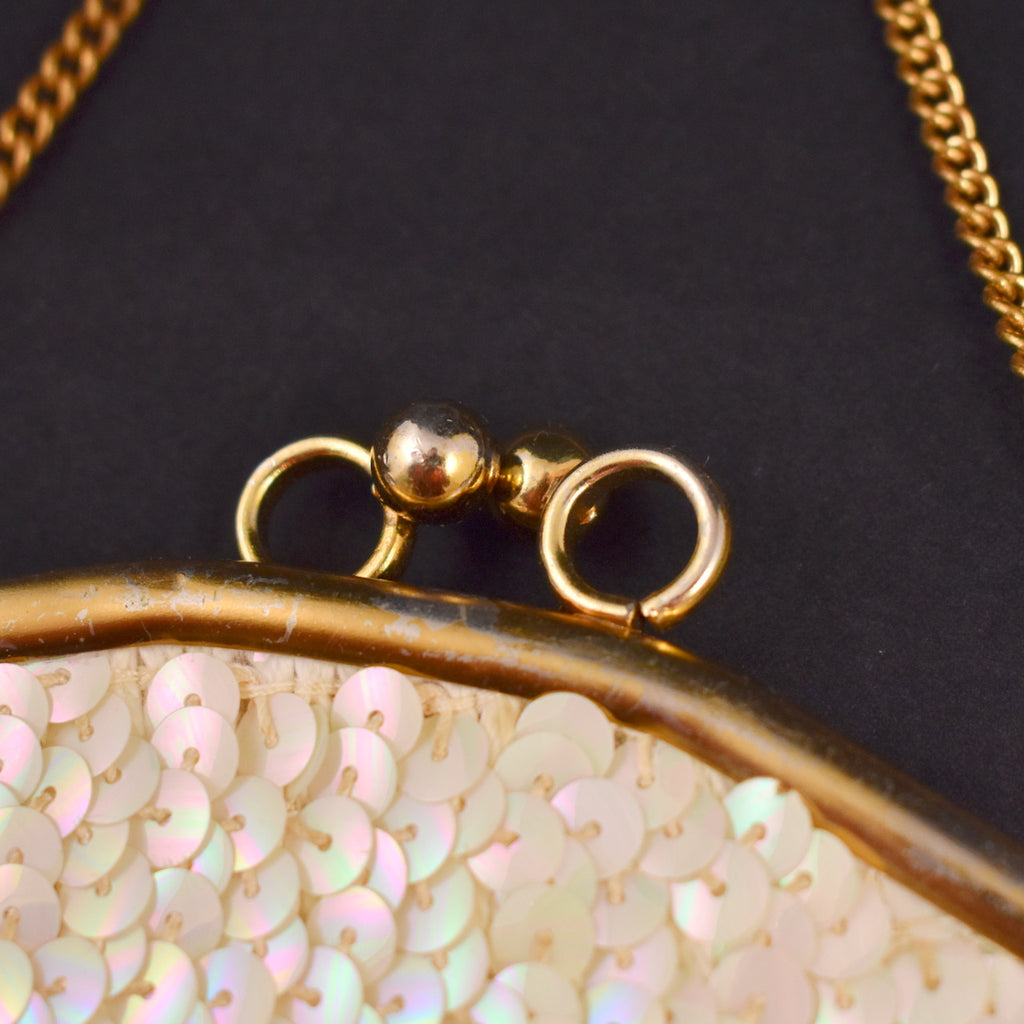 Here's a 1950s Little White Sequin Handbag that features a gold locking frame and chain with satin lining covered in iridescent sequins. No label, very clean inside, sequins intact. It is in very good condition, frame is scuffed and dull. It measures about 5 inches wide, 5 in tall. This is an authentic vintage piece in wearable condition, that has been cleaned and repaired (if necessary). Flaws will be noted, but please ask any questions you may have as this is a FINAL SALE item and cannot be returned.