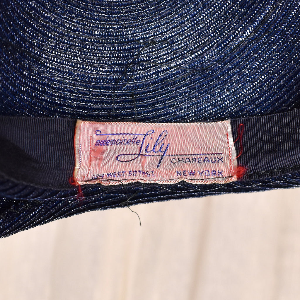 Here's a navy platter hat from the 1950s. Worn more like a topper that sits on your head, it won't crush your hairstyle! It's made of navy straw with a velvet bow. It's in excellent condition. Labeled "Mademoiselle Lily, New York". This is an authentic vintage piece in wearable condition, that has been cleaned and repaired (if necessary). Flaws will be noted, but please ask any questions you may have as this is a FINAL SALE garment and cannot be returned.