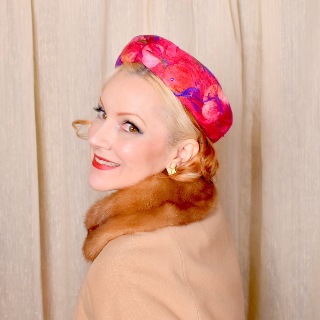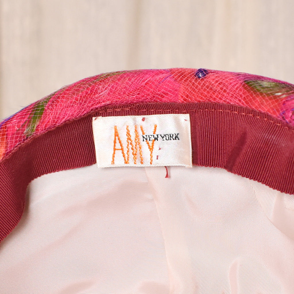 Here's a vintage hat to put a spring in your step! It's made of a bright pink base with green and blue feathers and pink hearts and rhinestones underneath pink netting, and a rounded brim all the way around, and pink velvet bow at the back. This hat is in excellent condition, missing one small rhinestone at the top. Measures about 21 inches around the inside, labeled "Amy New York". This is an authentic vintage piece in wearable condition, that has been cleaned and repaired (if necessary). Flaws will be noted, but please ask any questions you may have as this is a FINAL SALE garment and cannot be returned.