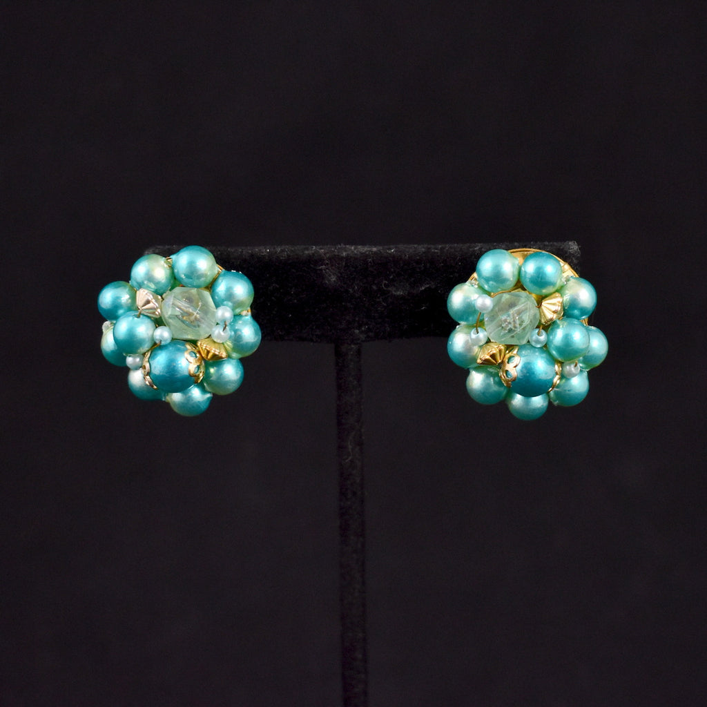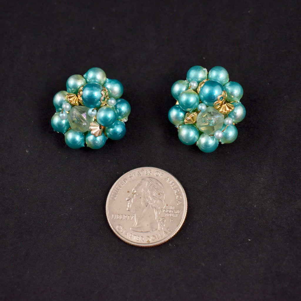 Give your outfit a vintage flair with these Aqua Pearl Cluster Earrings. They have gold tone clip-on backs and are 1 inch around. They are in very good condition, beads dull, scuffs on back, signed "Hong Kong" from the 1950s. These are an authentic vintage set in wearable condition, that has been cleaned and repaired (if necessary). Flaws will be noted, but please ask any questions you may have as this is a FINAL SALE item and cannot be returned.