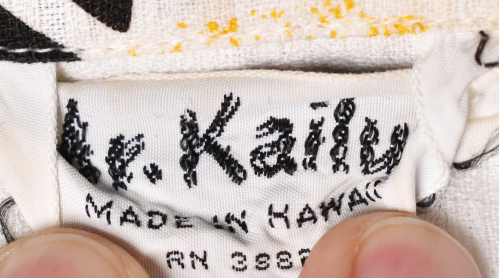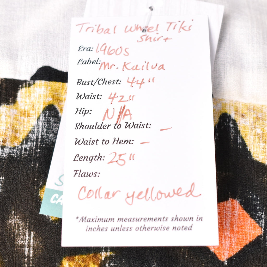 Hey fellas grab that tiki drink! This is a men's vintage Hawaiian button down shirt with a black and orange design on a brown/gold and white background. It has a front chest pocket and all the original buttons. It's labeled "Mr. Kailua Made in Hawaii". It is in very good condition, inside collar yellowed. The chest measures 44 inches, waist 42 inches, shoulder seam to shoulder seam 18 inches, length 25 inches. This is an authentic vintage piece in wearable condition, that was cleaned and repaired (if necessary). Flaws will be noted, but please ask any questions you may have, as this is a FINAL SALE garment and cannot be returned. All items are measured flat the same way we measure our reproduction items. The maximum measurement is listed. Most vintage fabrics do no have stretch, so please take into consideration when looking at size.