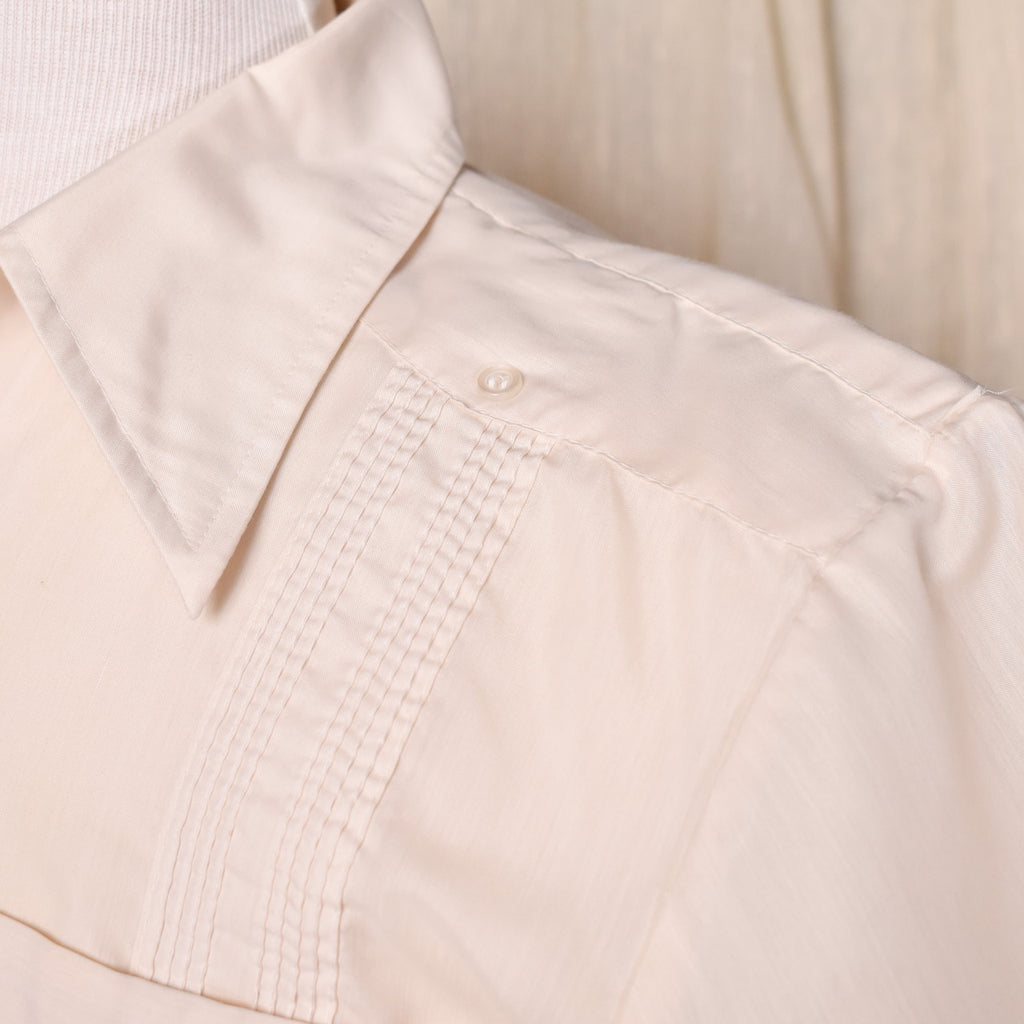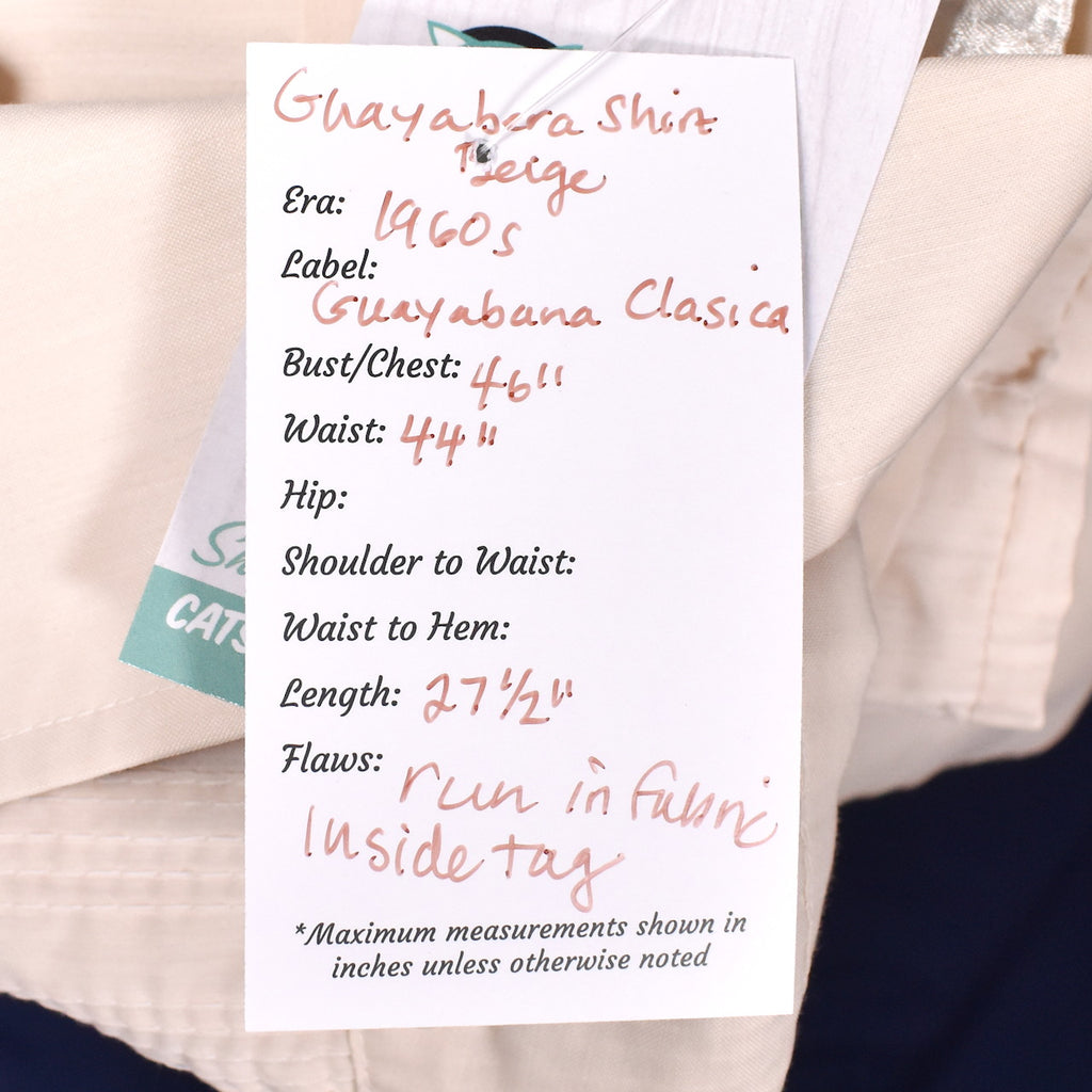 Here's a casual authentic 1960s classic Guayabera Shirt. This is a short sleeve lightweight beige shirt. It buttons down the front, has four pockets with vertical stitching, pleats and buttons, and it's labeled "Guayabana Clasica, 80% polyester 20% cotton, permanent press". It is in very good condition, inside collar under tag not stitched, not noticeable from outside, horizontal run in the fabric. It has all the pockets, sleeves, side and back buttons. The chest measures 46 inches, shoulder to shoulder 18 inches, waist 44 inches and length is 27 1/2 inches. This is an authentic vintage piece in wearable condition, that has been cleaned and repaired (if necessary). Flaws will be noted, but please ask any questions you may have, as this is a FINAL SALE garment and cannot be returned. All items are measured flat, the same way we measure our reproduction items. The maximum measurement is listed. Most vintage fabrics do not have stretch, so please take into consideration when looking at size.