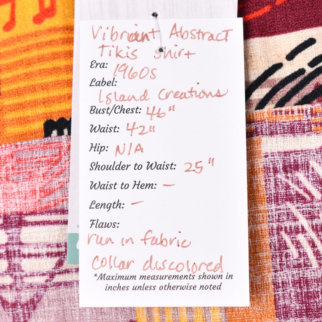 Hey fellas grab that tiki drink! This is a men's vintage Hawaiian button down shirt with a black, orange, red, burgundy, yellow, and off white abstract tikis. It has a small front chest pocket and all the original buttons. It's labeled "Island Creations, fashioned for leisure. pool. patio. beach., 100% cotton, machine wash". It is in very good condition, inside collar discolored, run in fabric on chest. The chest measures 46 inches, waist 42 inches, shoulder seam to shoulder seam 18 inches, length 25 inches. This is an authentic vintage piece in wearable condition, that was cleaned and repaired (if necessary). Flaws will be noted, but please ask any questions you may have, as this is a FINAL SALE garment and cannot be returned. All items are measured flat the same way we measure our reproduction items. The maximum measurement is listed. Most vintage fabrics do no have stretch, so please take into consideration when looking at size.