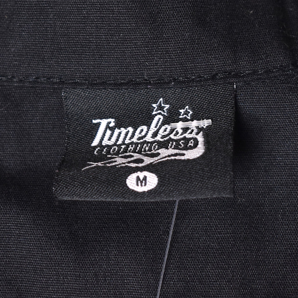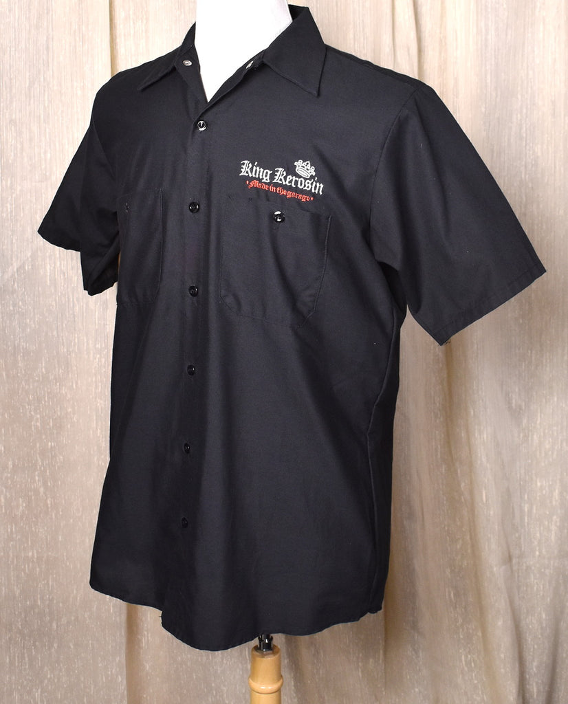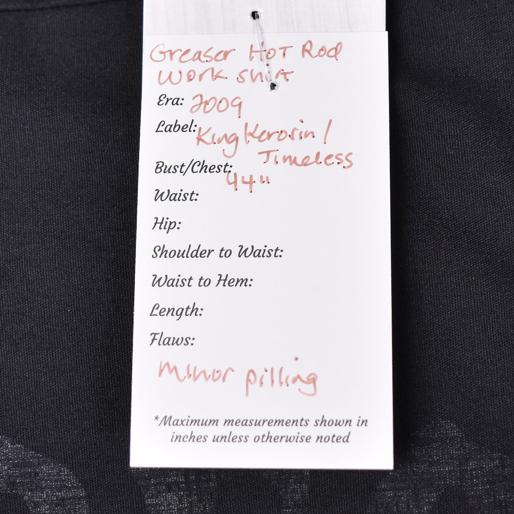 Almost vintage, this work shirt is a King Kersoin/ Timeless brand with a greaser print on the back from 2009. It's black with buttons down the front and two front pockets. Near excellent condition, very very minor collar pilling, 100% cotton, Medium. Chest measures 44 inches, shoulder to shoulder 17 1/2 inches. This is an authentic almost vintage piece in wearable condition, that was cleaned and repaired (if necessary). Flaws will be noted, but please ask any questions you may have, as this is a FINAL SALE garment and cannot be returned. All items are measured flat the same way we measure our reproduction items. The maximum measurement is listed. Most vintage fabrics do no have stretch, so please take into consideration when looking at size.