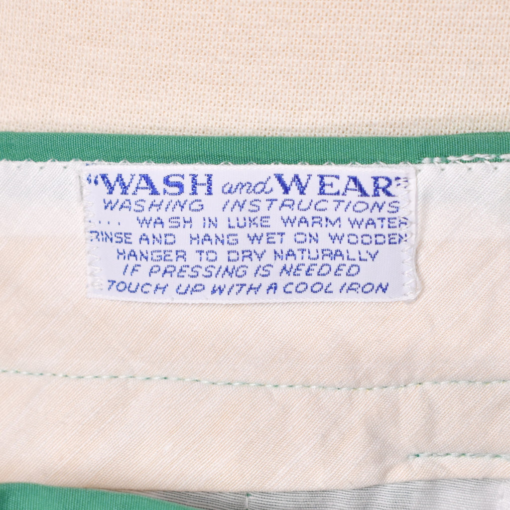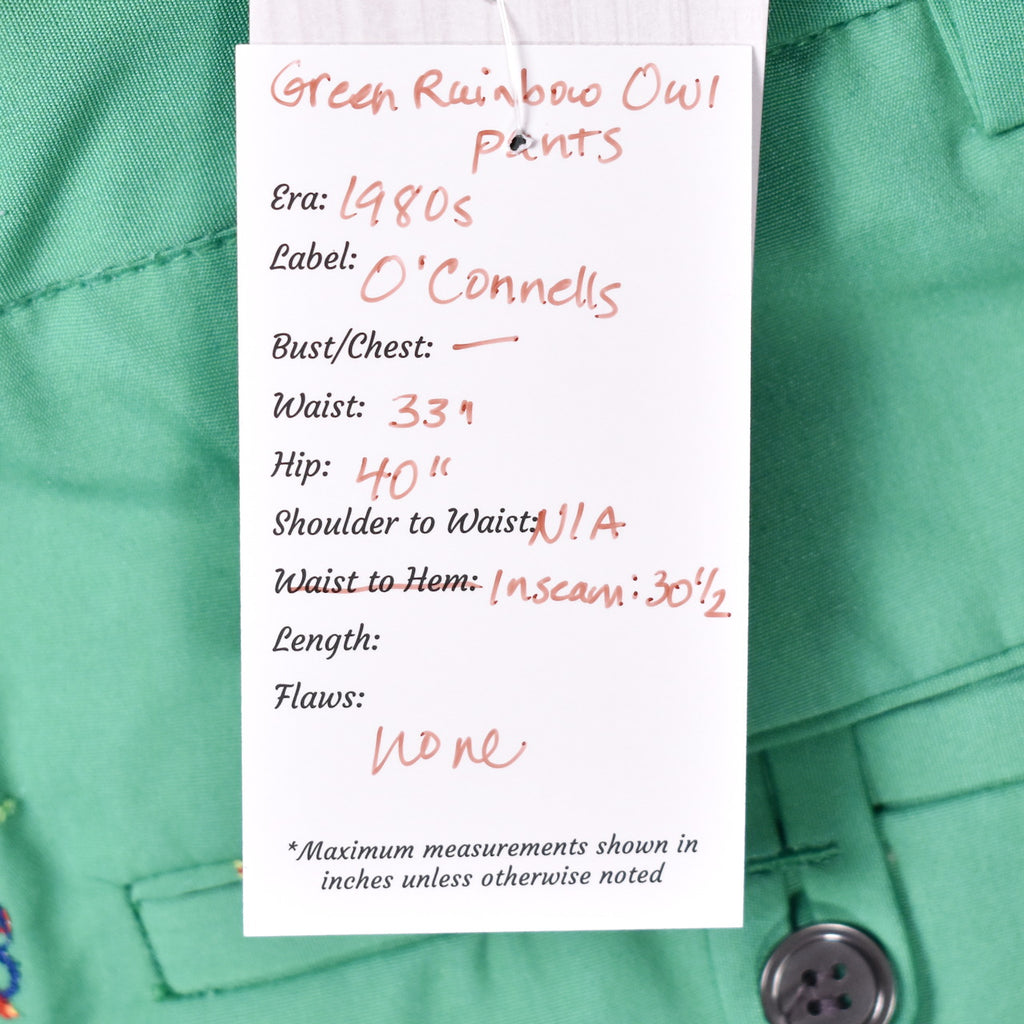 The ultimate preppy ivy league style is khakis, but make them fun! These trousers are kelly green with rainbow embroidered owls throughout. They feature a hook and eye, inside button and zipper closure front, two hip pockets and two back pockets, and belt loops. These are in excellent condition and the inside tag reads, "O'Connell's Lucas Chelf, Wash and Wear washing instructions". If you aren't familiar with O'Connells, and you like "preppy wear", you should be! They are a high end clothing store in Buffalo, NY that has been around since 1959. Much of what they sell is the same as when they opened. Wool sweaters, blazers, khakis, madras, and much more. Everything is made in the US, Canada, or UK and they are known for quality. These pants measure waist 33 inches, hips 40 inches, inseam 30 1/2 inches, rise 11 1/2 inches. Fabric feels like a cotton/ poly blend. This is an authentic vintage piece in wearable condition, that has been cleaned and repaired (if necessary). Flaws will be noted, but please ask any questions you may have as this is a FINAL SALE garment and cannot be returned. All items are measured flat the same way we measure our reproduction items. The maximum measurement is listed. Most vintage fabrics do not have stretch, so please take into consideration when looking at size.
