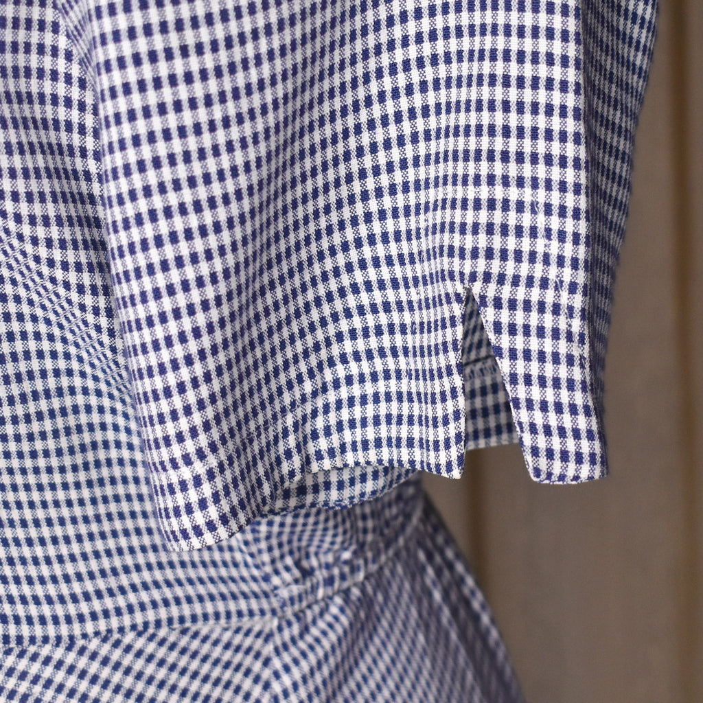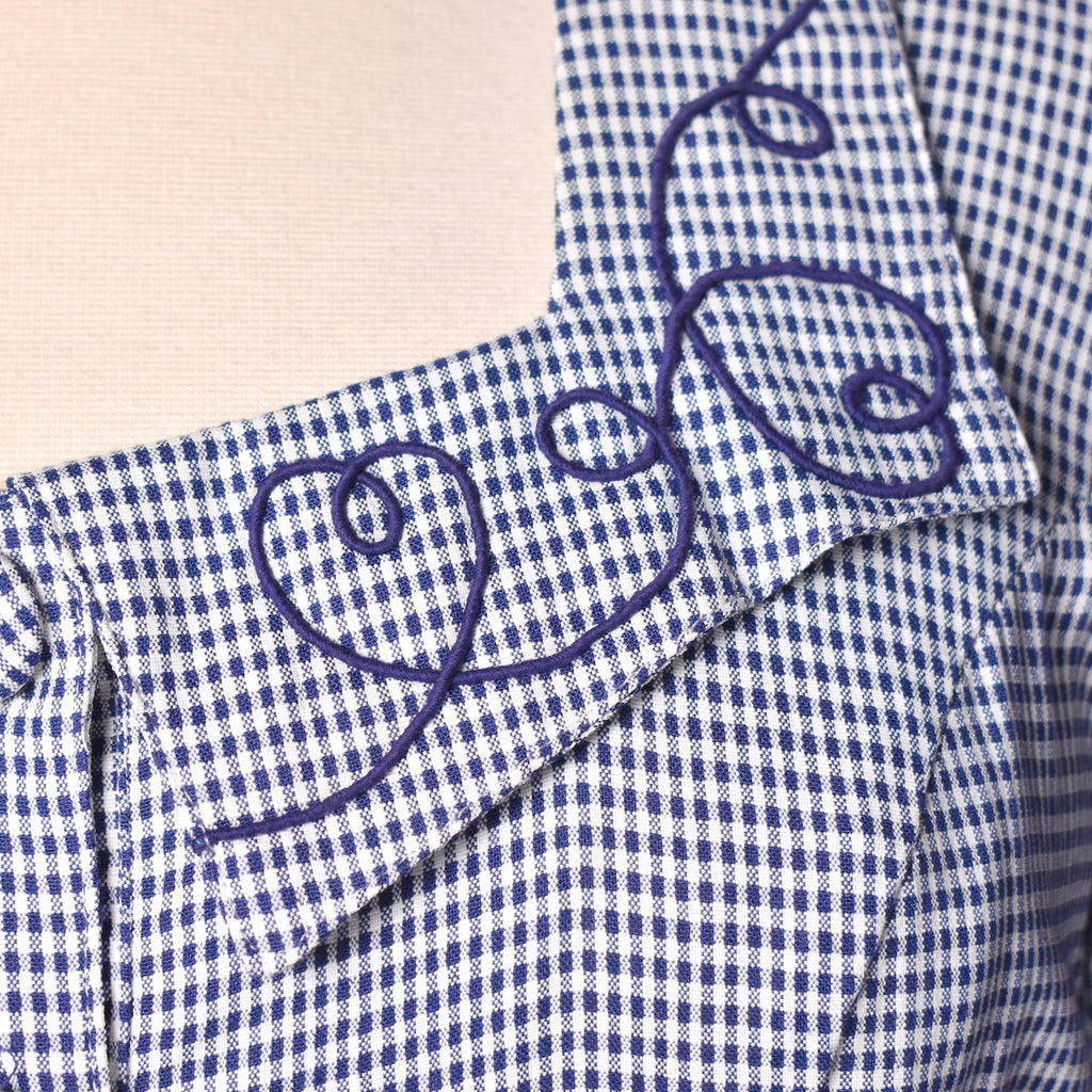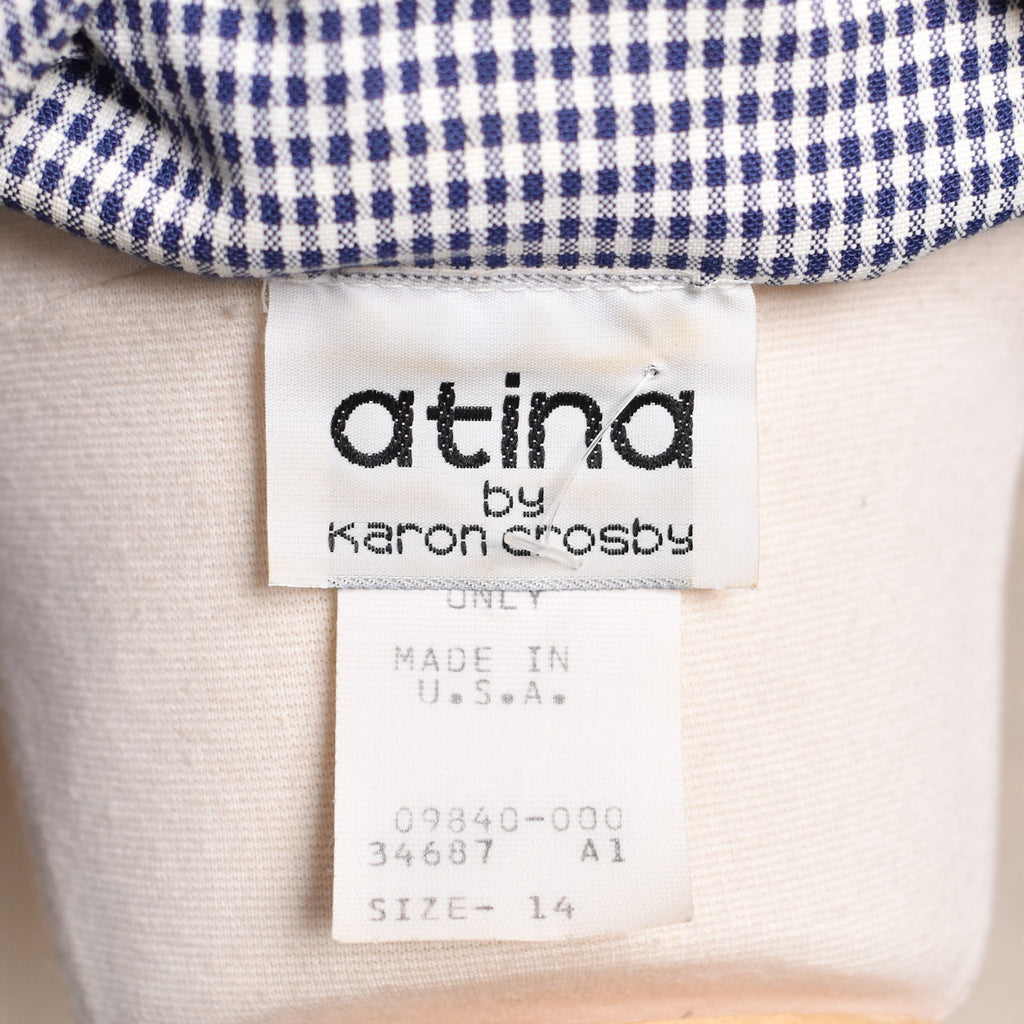 Here's a nice example of a 1990s does 1940s shirt dress. It's navy blue and white gingham print with short notched sleeves, functional buttons on the chest, elastic back waist, shoulder pads (that can be removed if you prefer), and pretty heart shaped soutache collar. Labeled "Atina by Karen Crosby, Made in the USA, 52% acetate 48% rayon, dry clean only, 14". The bust of the dress measures 44 inches max, the waist 32-36 inches comfortably and the hips 50 inches, length about 50 inches. Shown on a dress form that measures Bust 42 inches, Waist 32 inches, Hips 43 1/2 inches. It's in excellent condition. This dress just goes on over the head, no zipper to worry about. This is an authentic vintage piece in wearable condition, that was cleaned and repaired (if necessary). Flaws will be noted, but please ask any questions you may have, this is a FINAL SALE garment and cannot be returned. All items are measured flat the same way we measure our reproduction items. The maximum measurement is listed. Most vintage fabrics do not have stretch, so please take that into consideration when looking at size.