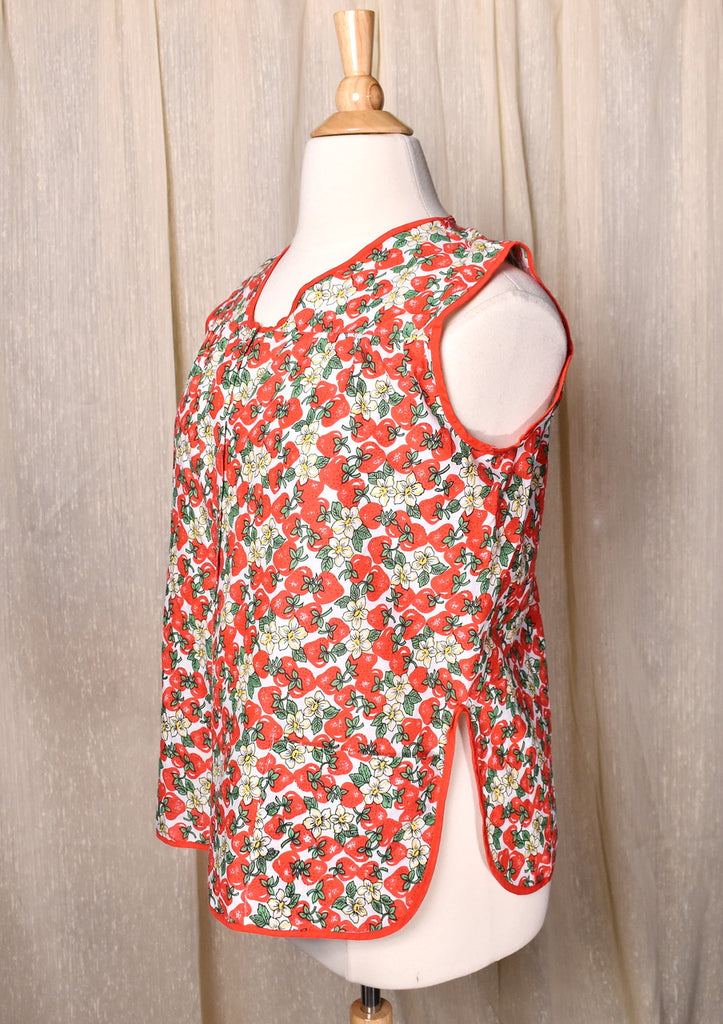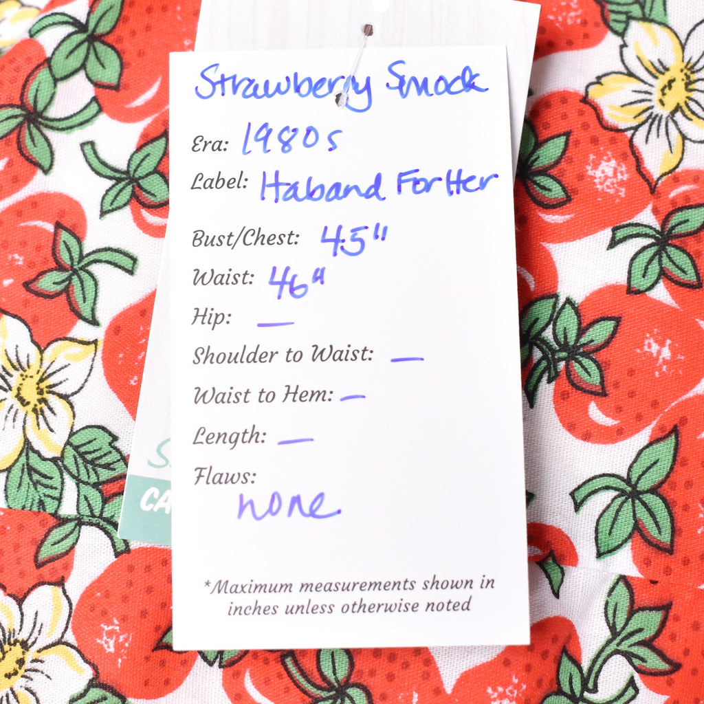 Sometimes you need more coverage on top when cooking and a smock apron will do the trick! This is an adorable red, green, white, strawberry print, sleeveless 1980s smock top with hip pockets, and snaps down the front. The bust measures a maximum of 45 inches, and the waist up to 46 inches maximum. Shown on a dress form that measures Bust 42 inches, Waist 32 inches, Hips 43 1/2 inches. It's in excellent condition, labeled "Haband for Her 50% polyester 50% cotton, Made in the USA". This is an authentic vintage piece in wearable condition. Flaws will be noted, but please ask any questions you may have as this is a FINAL SALE garment and cannot be returned. All items are measured flat the same way we measure our reproduction items. The maximum measurement is listed. Most vintage fabrics do not have stretch, so please take that into consideration when looking at size.