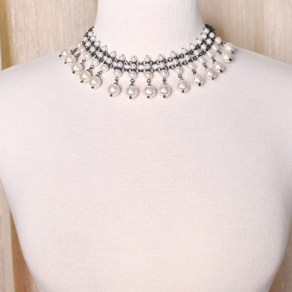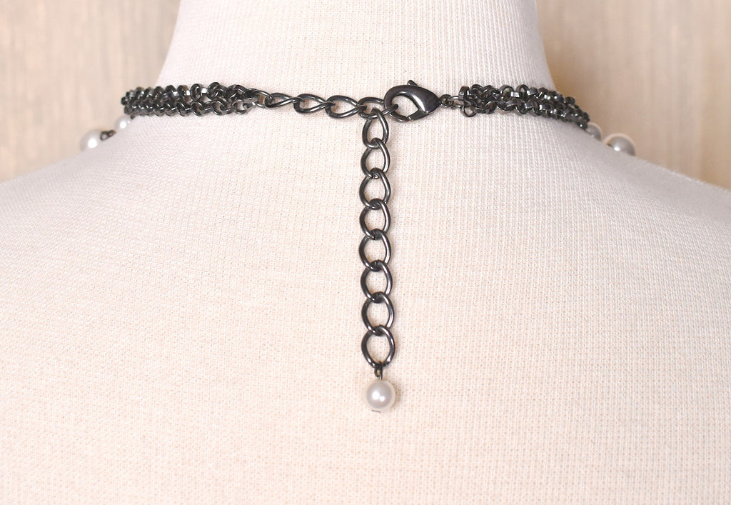 Want to dress up a boring collar, or sick of the plain gold necklace, or just want to jazz up an outfit? Here's a pretty dangling collar vintage necklace! It's unmarked and in excellent condition, lobster claw clasp. Faux pearl beads, antique silver chain, and small faceted marcasite beads hanging down the front. Measures 15-19 inches long, 1990s. This is an authentic vintage piece in wearable condition, that has been cleaned and repaired (if necessary). Flaws will be noted, but please ask any questions you may have as this is a FINAL SALE item and cannot be returned.