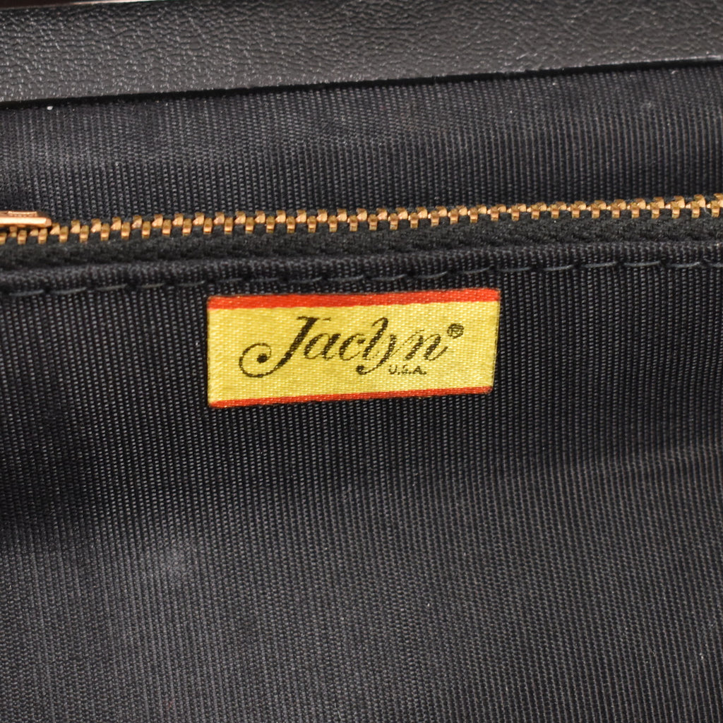Here's a vintage 1950s deep red striped and flocked carpet handbag, that's super vampy! It has a single black leather handle with gold latch, lined in black with a small side pocket, zipper pocket, four metal feet, and labeled "Jaclyn". It is in very good condition. It measures about 10 inches wide at it's base, 4 inches tall, about 4 inches deep at the bottom. This is an authentic vintage piece in wearable condition, that has been cleaned and repaired (if necessary). Flaws will be noted, but please ask any questions you may have as this is a FINAL SALE item and cannot be returned.