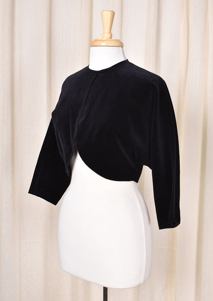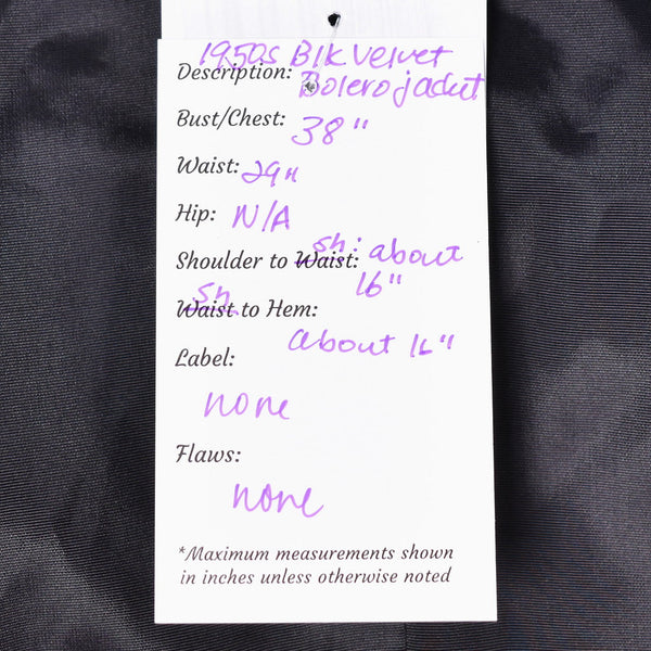 This is a beautiful vintage black bolero jacket in excellent condition, it features 3/4 length sleeves, a rounded hem with a little button on the top collar, and it's fully lined. It measures about Bust 38" Waist 29" Shoulder to shoulder about 16" and length about 16". Shown on a mannequin that measures B36 W25 H36. No label lining feels like acetate. This is an authentic vintage piece in wearable condition, that has been cleaned and repaired (if necessary). Flaws will be noted, but please ask any questions you may have as this is a FINAL SALE garment and cannot be returned. All items are measured flat the same way we measure our reproduction items. The maximum measurement is listed. Most vintage fabrics do not have stretch, so please take into consideration when looking at size.