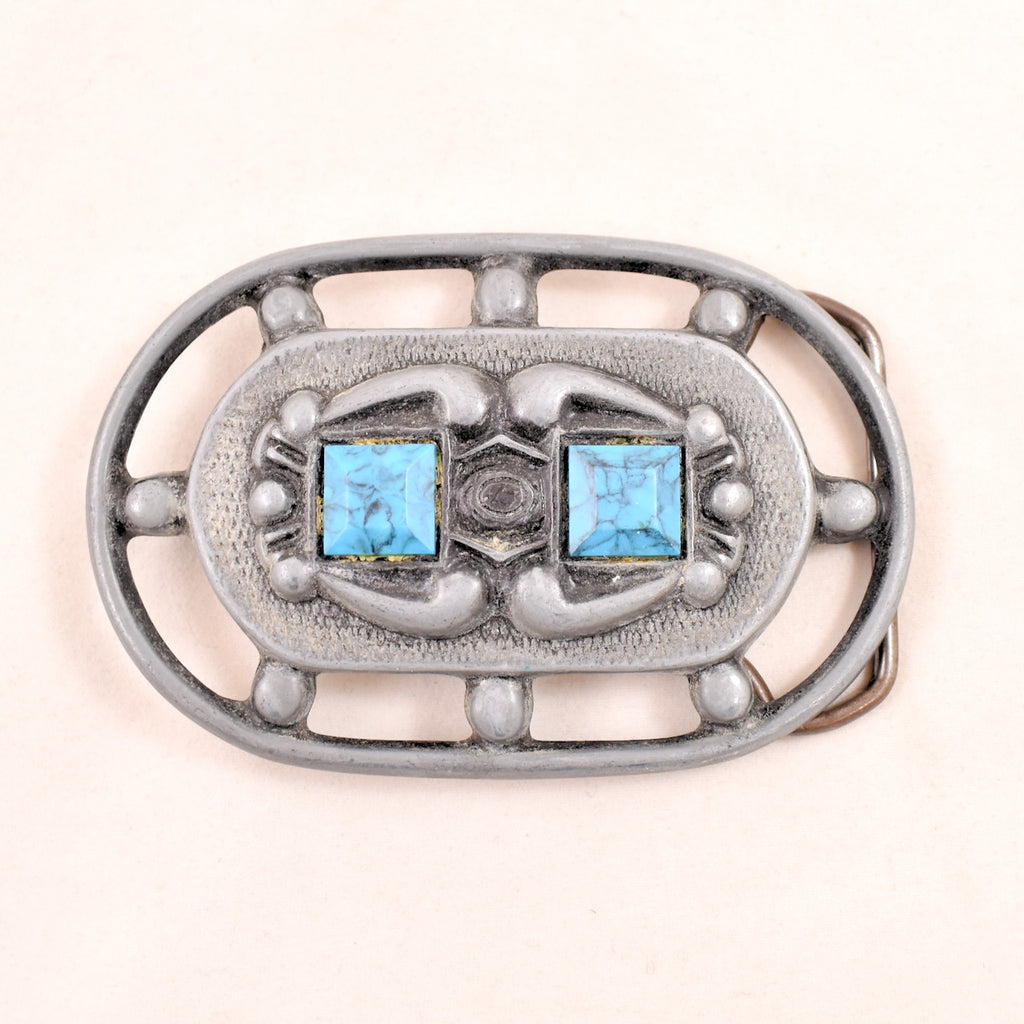 Belt buckles are a great way to show off your style and interests and they took off with commercial success in the 1970s. This belt buckle is in the navajo style with faux turquoise on the front, measures 3 3/4 inches wide and 2 1/2 inches tall, stamped "W' on the back. It's in good condition, minor scuffs and discoloration from age as pictured. This is an authentic vintage buckle in wearable condition, that has been cleaned and repaired (if necessary). Flaws will be noted, but please ask any questions you may have as this is a FINAL SALE item and cannot be returned.