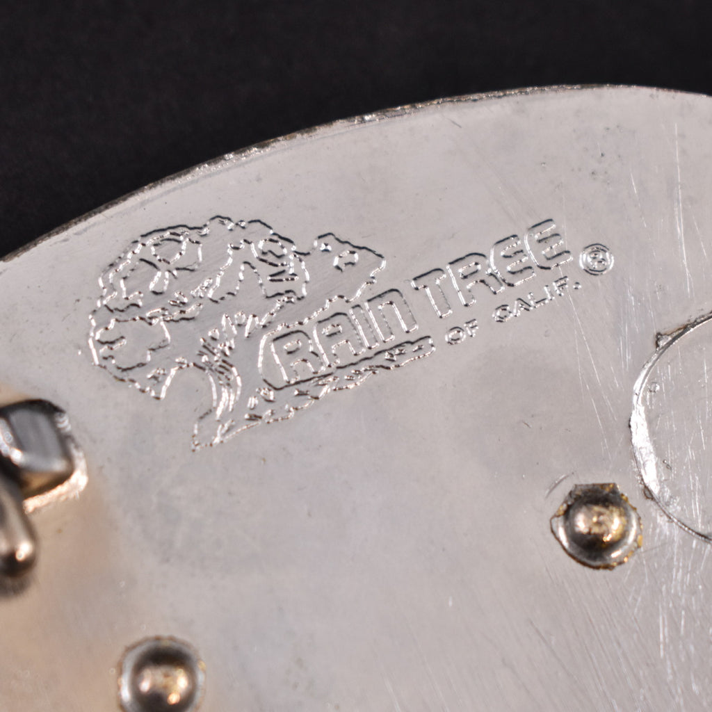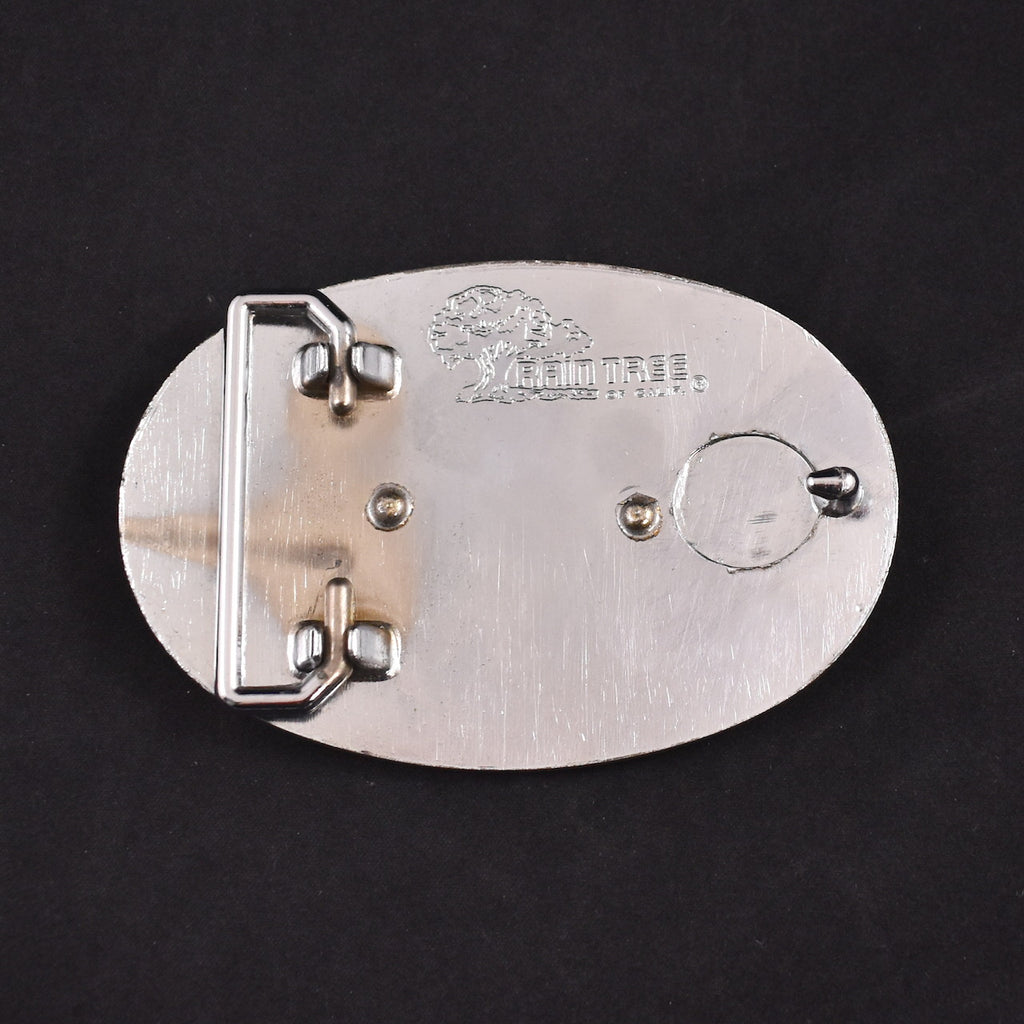 Belt buckles are a great way to show off your style and interests and they took off with commercial success in the 1970s. This belt buckle is mirror silvertone with a brass train on the front, in good condition, scuffs and discoloration, but still presents beautifully, measures 3 1/2 inches wide and 2 1/4 inches tall, stamped on the back "Rain Tree of California". This is an authentic vintage buckle in wearable condition, that has been cleaned and repaired (if necessary). Flaws will be noted, but please ask any questions you may have as this is a FINAL SALE item and cannot be returned.
