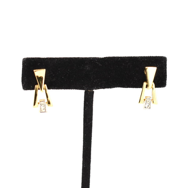 A true vintage classic, is a matching necklace and earring set! The necklace is a thick gold tone chain with a diamond shaped pendant with an encrusted rhinestone center. The chain is 24 1/2 inches long, pendant is 2 inches long, and the earrings are deco inspired clip backs with rhinestones that measure ¾ inches long. The earrings are signed “Trifari” but the necklace is unsigned. They came in the same box, and I couldn’t find more information on the necklace, so they are being sold as a set. I believe they are from the 1990s when Trifari was being sold as Monet jewelry. Both are in excellent condition. Rhinestone setting on necklace looks slightly off center, not sure if it was meant to be this way to give it depth. This is an authentic vintage set in wearable condition, that has been cleaned and repaired (if necessary). Flaws will be noted, but please ask any questions you may have as this is a FINAL SALE item and cannot be returned.