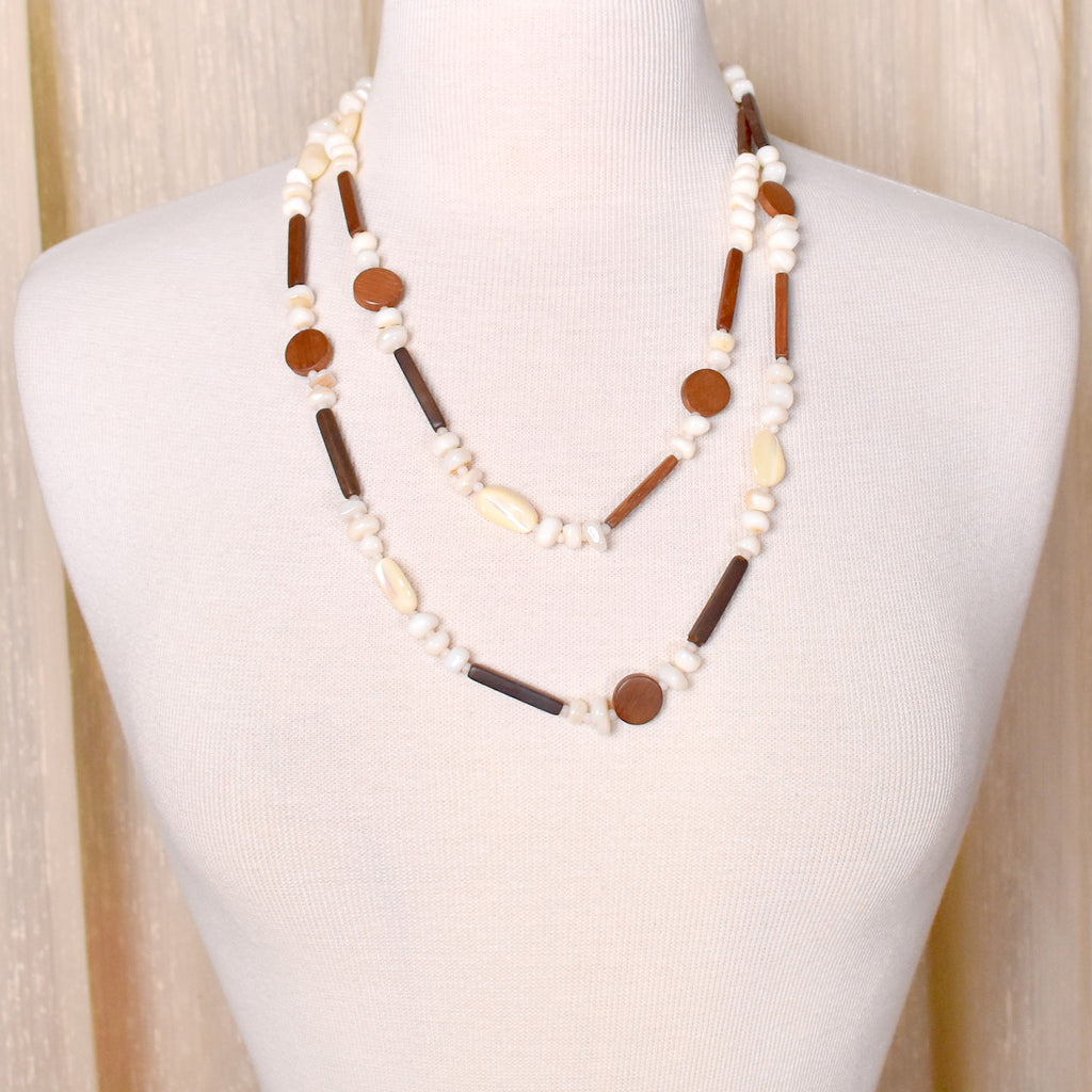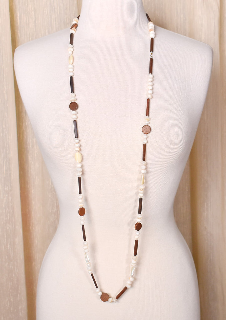 Extra Long Mother of Pearl & Wood Bead Necklace