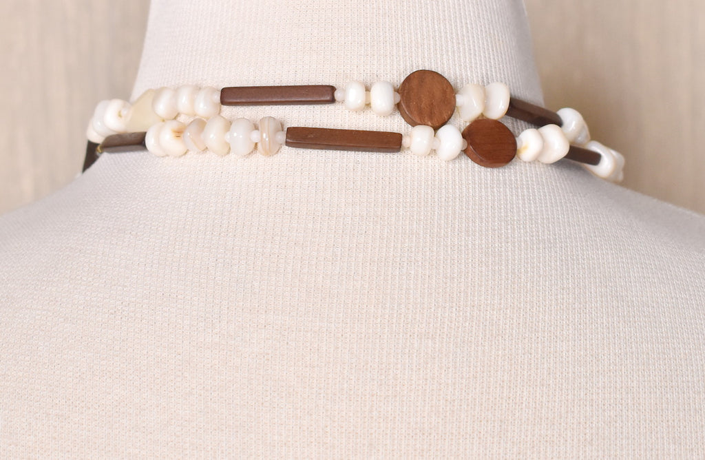You can't go wrong with a classic tiki necklace! This is an extra long tumbled mother of pearl and wood bead necklace. Wear it with a T-shirt or dress and everything in between! The necklace measures 50 inches long, and it's in excellent condition, 1960s, unsigned. This is an authentic vintage piece in wearable condition, that has been cleaned and repaired (if necessary). Flaws will be noted, but please ask any questions you may have as this is a FINAL SALE item and cannot be returned.