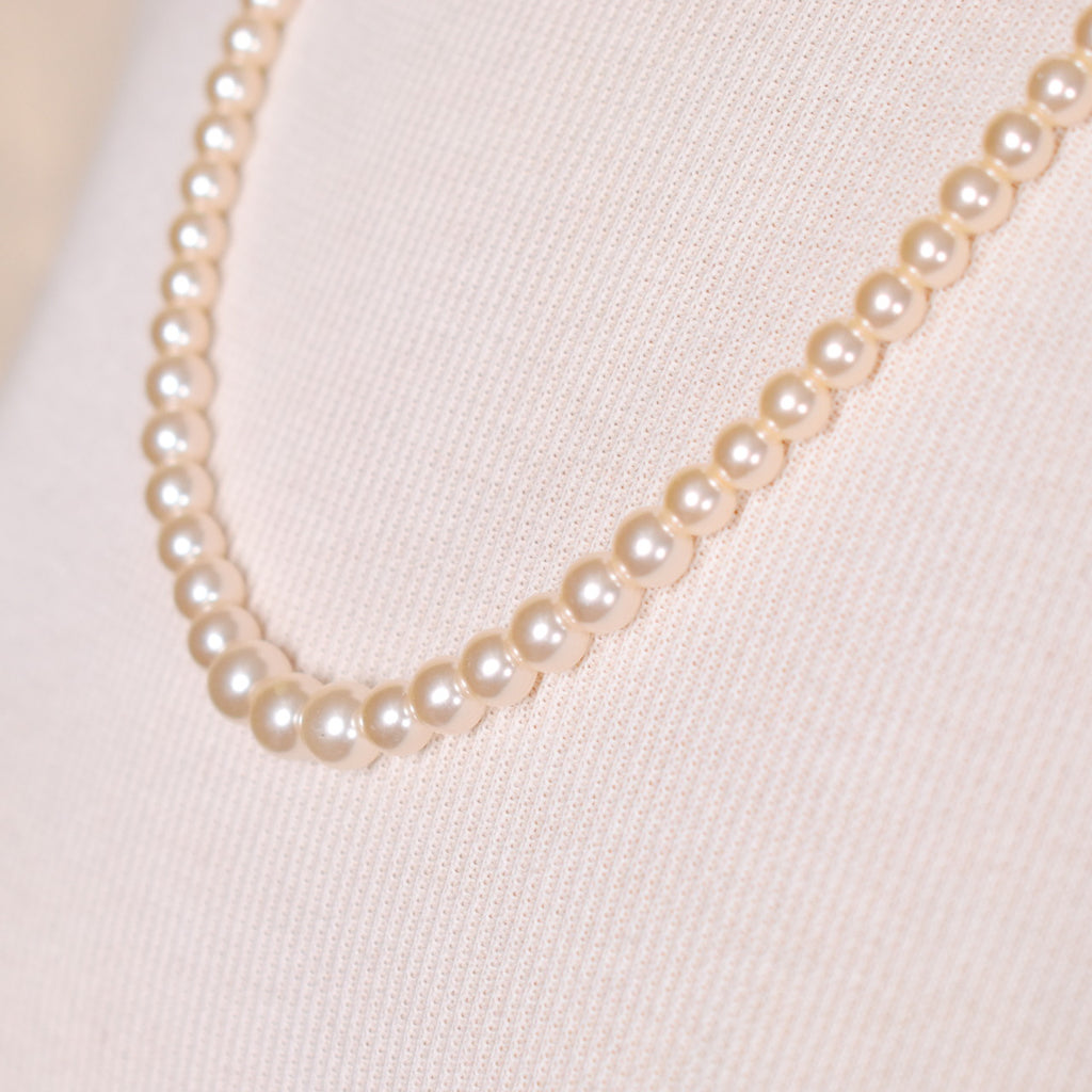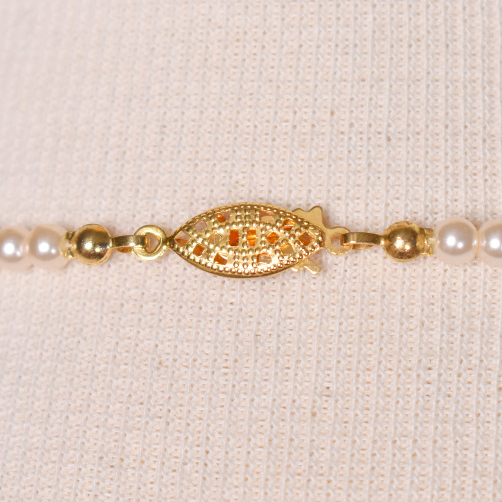 You can't go wrong with a classic! This is a faux pearl bead necklace. Wear it with a T-shirt or dress and everything in between! The necklace measures about 23 1/2 inches long, beads are slightly bigger in the middle, and it's in excellent condition, minor discoloration on the back of the push in fish hook clasp, 1980s. This is an authentic vintage piece in wearable condition, that has been cleaned and repaired (if necessary). Flaws will be noted, but please ask any questions you may have as this is a FINAL SALE item and cannot be returned.