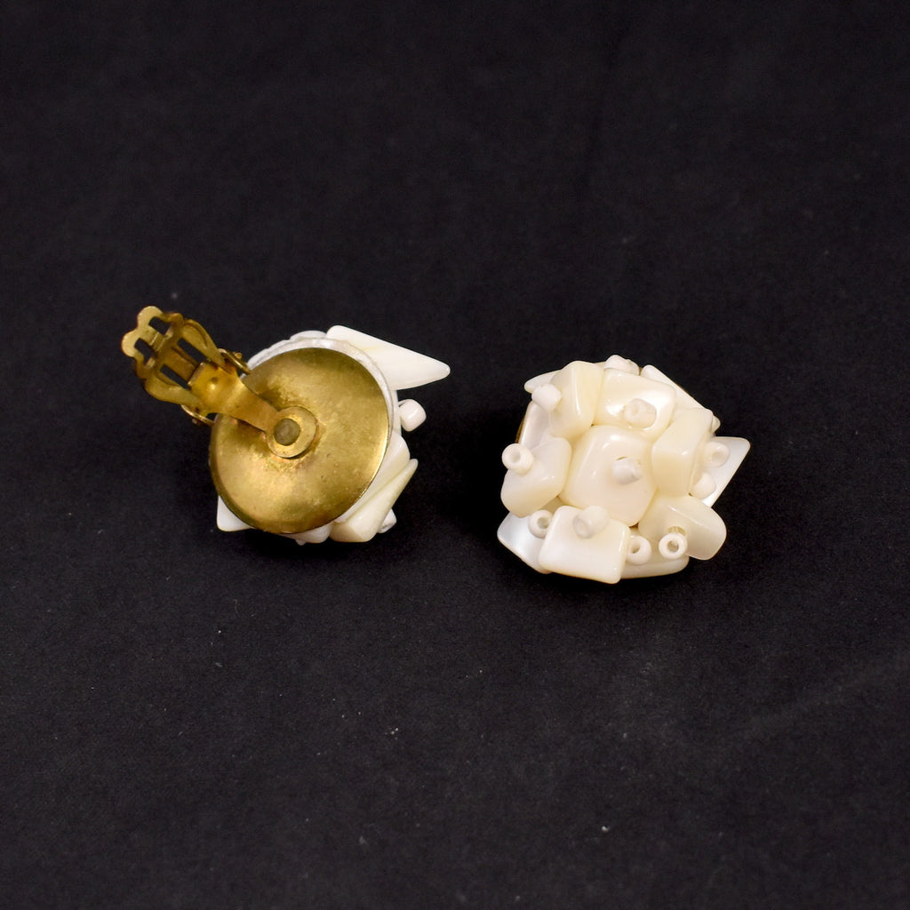 Give your outfit a vintage flair with these Mother of Pearl Cluster Earrings. They have gold tone clip on backs and are 1 inch around. They are in very good condition, discolored backing, signed "Japan" from the 1950s. These are an authentic vintage set in wearable condition, that has been cleaned and repaired (if necessary). Flaws will be noted, but please ask any questions you may have as this is a FINAL SALE item and cannot be returned.
