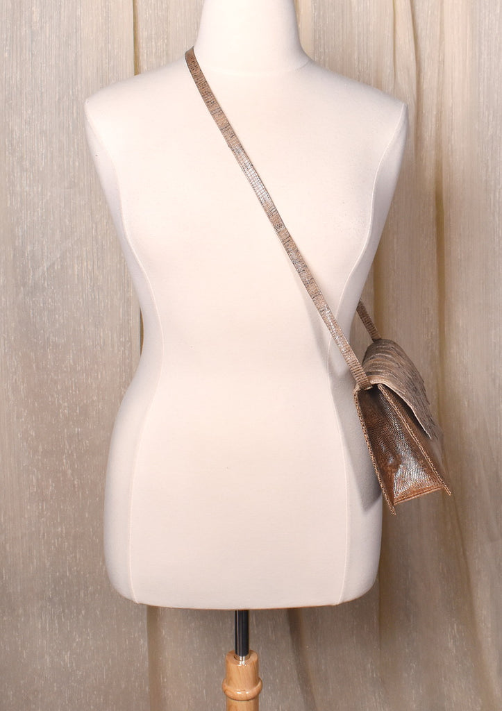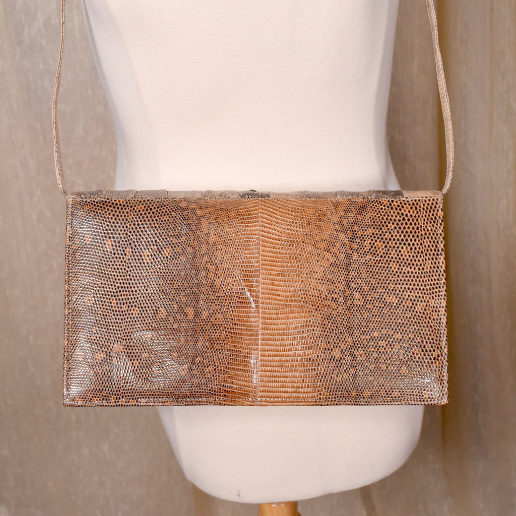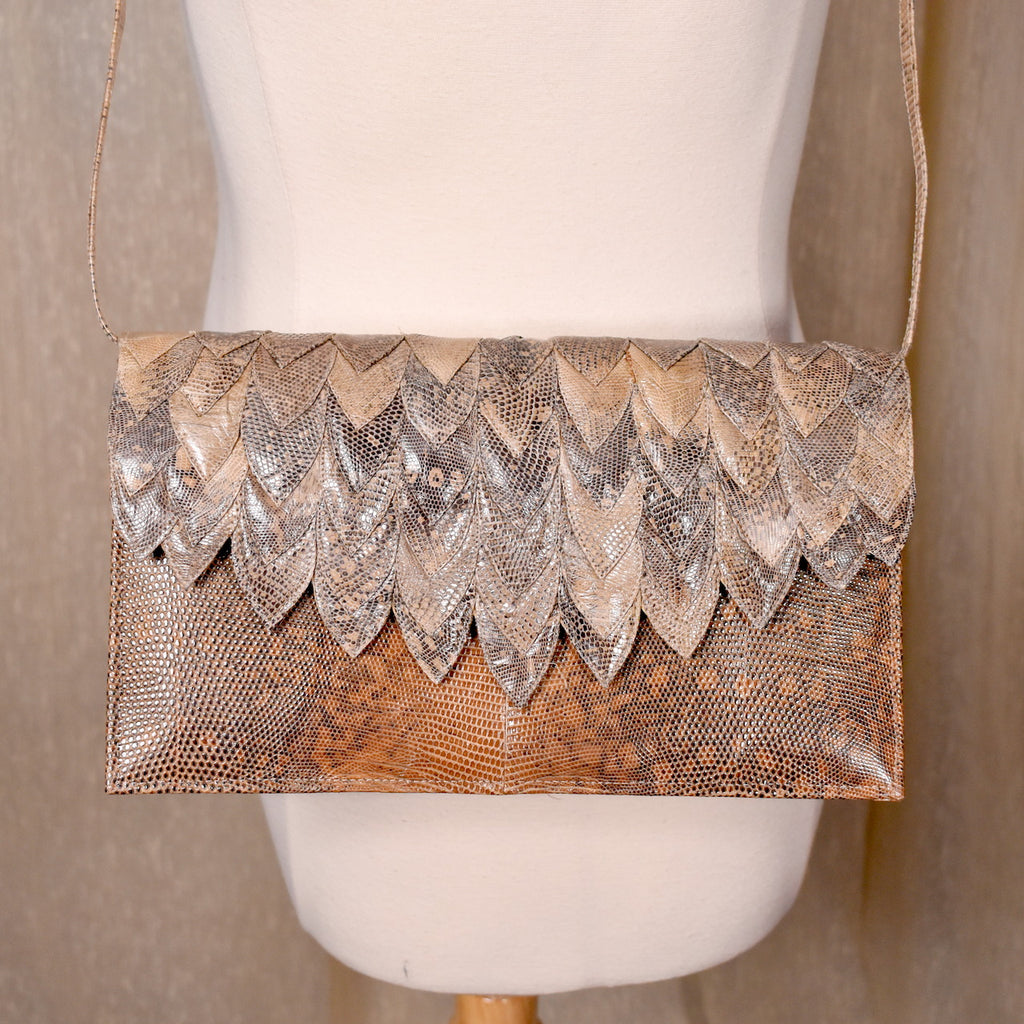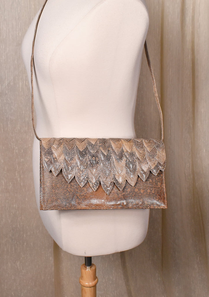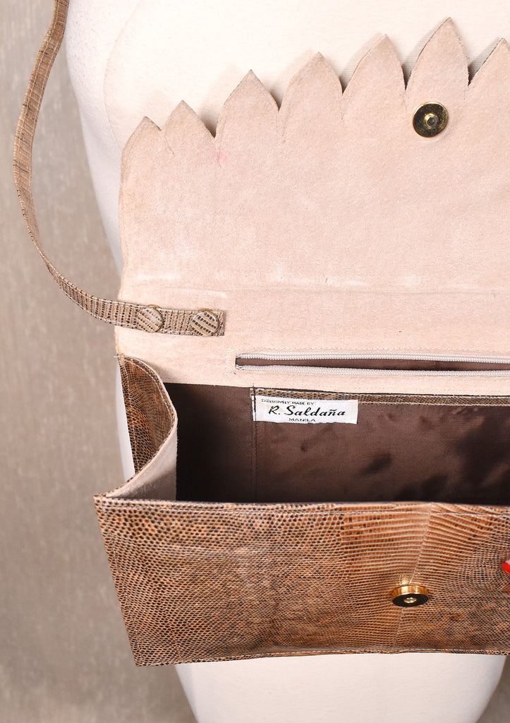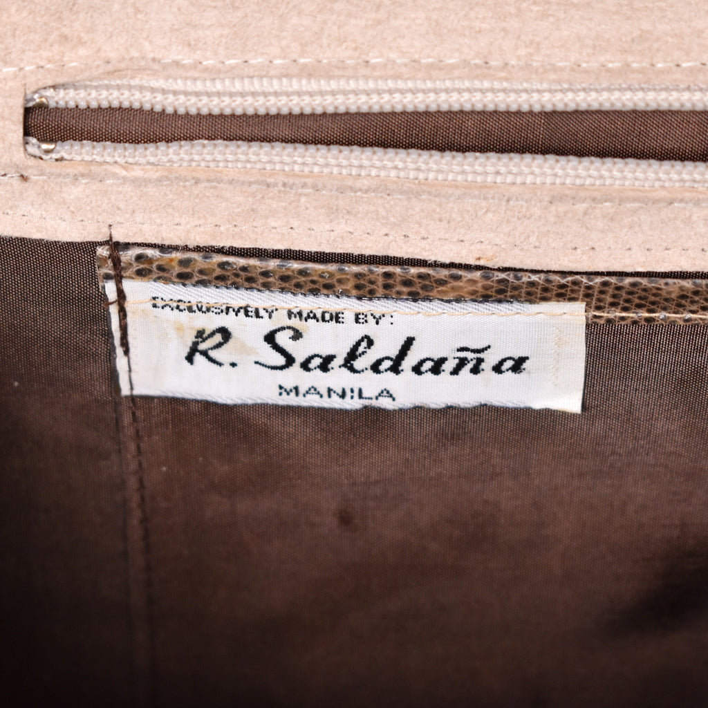 Add a bold statement bag to any outfit! This one is from the 1980s, but looks 1940s with neutral brown and tan snakeskin outside and petal design snap closure. It is in excellent condition, but there's a faded mark on the inside, never used with original matching snap on strap if you prefer. The inside had a flat card pocket and zipper pocket. The label is "Exclusively made by R. Saldana Manila". It measures about 11 1/2 wide by 6 1/2 inches tall and about 2 1/2 inches deep. This is an authentic vintage piece in wearable condition, that has been cleaned and repaired (if necessary). Flaws will be noted, but please ask any questions you may have as this is a FINAL SALE garment and cannot be returned. All items are measured flat the same way we measure our reproduction items.